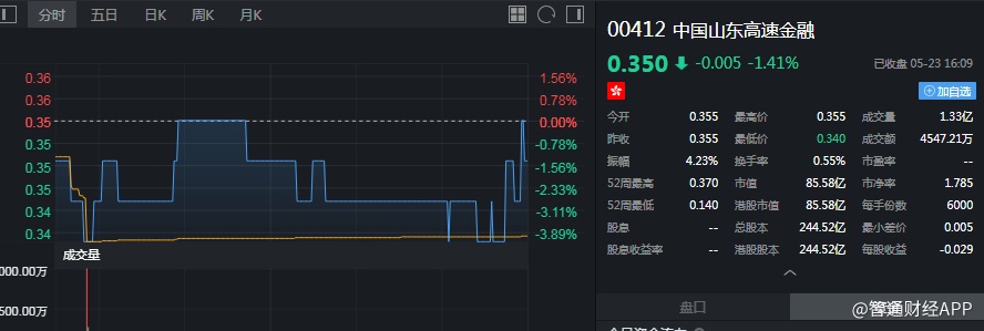 截至今日收盘,中国山东高速金融(00412)跌1.41%,报0.35港元。