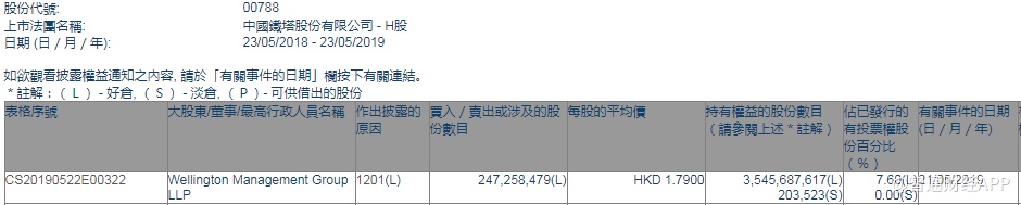 智通财经APP获悉,根据联交所资料显示,威灵顿管理于5月21日减持中国铁塔(00788)2.47亿股,每股作价1.79港元,总值约4.42亿元,最新持股数目约35.45亿股,最新持股比例为7.6%。