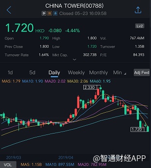 截至今日收盘,中国铁塔(00788)跌4.44%,报1.72港元。