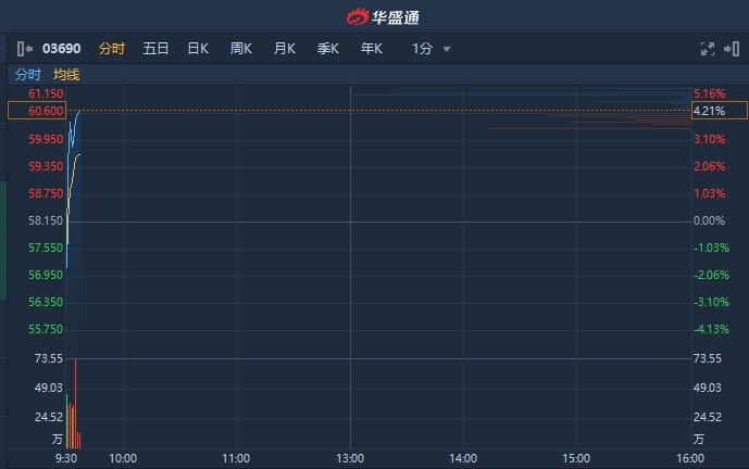 智通财经APP获悉,美团点评-W(03690)早盘低开后直线拉升,截至9时36分,涨4.21%,报60.6港元,成交额达2.069亿港元。