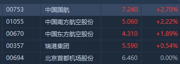 智通财经APP获悉,航空股早盘集体反弹,截至发稿,国航(00753)、南航(01055)涨超2%,东航(00670)涨1.89%。