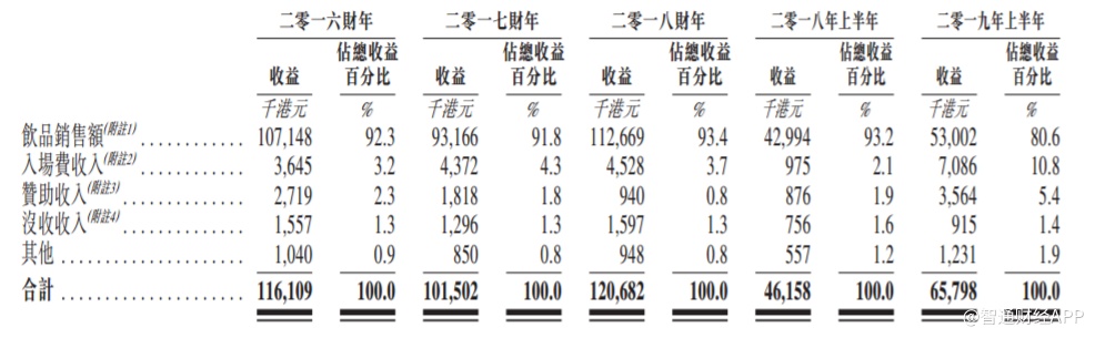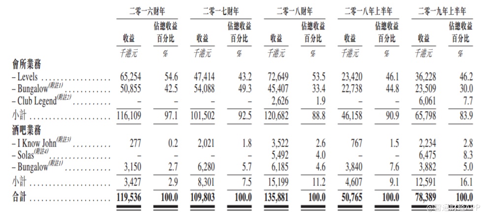于往绩记录期,该集团自会所业务产生大部分收入,分别占2016财年、2017财年、2018财年及2019年上半年的97.1%、92.5%、88.8%及83.9%。