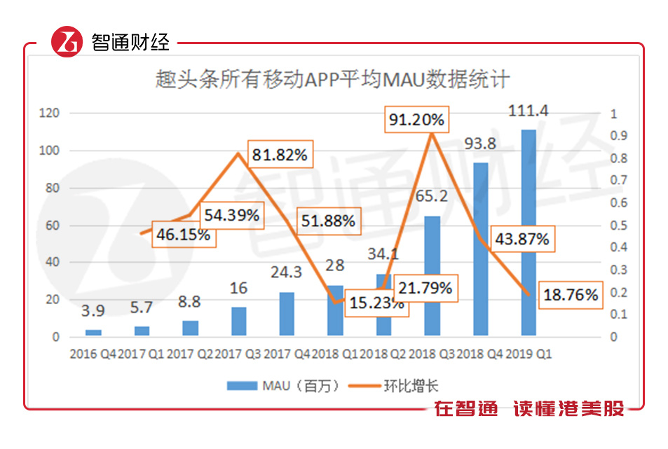 从所有移动应用的平均MAU(月活跃用户数)数据看,趣头条的用户仍保持着快速增长。2019年一季度时,平均MAU突破1亿大关,同比增长297.4%,环比增长18.76%。