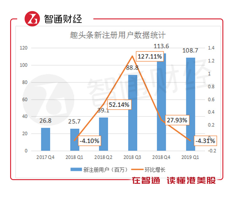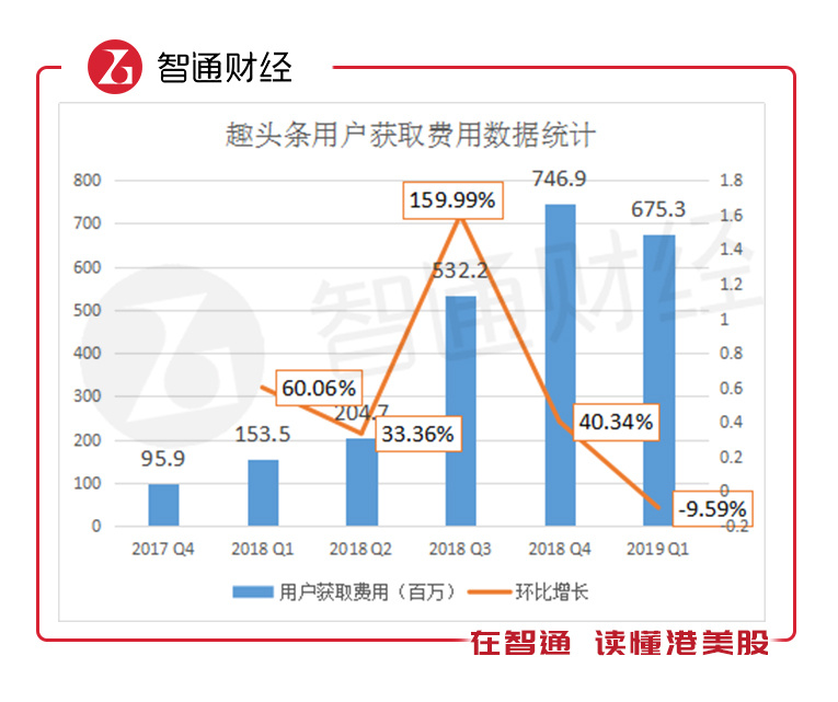 智通财经APP整理了2017年第四季度以来趣头条的新注册用户数据及用户获取费用,可以看到,在用户获取费用增长越快时,新注册用户数也就越高。2019年一季度时,新注册用户达1.087亿,但由于用户获取费用环比缩减约10%至6.75亿,新注册用户环比亦跌4.31%。