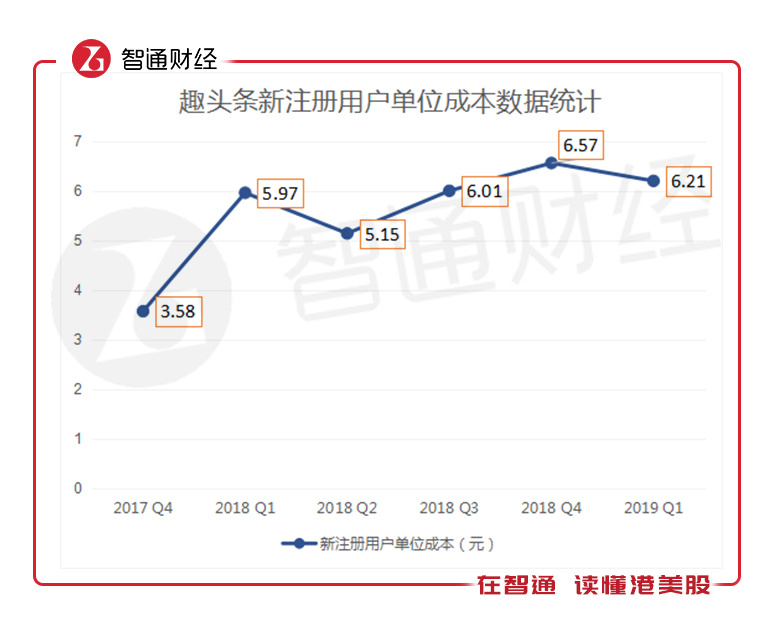 如此高的相关性,“花钱买用户”的称谓一点儿也不假。不过,在买用户的同时,趣头条的单位获客成本也有了很大的提升。2019年一季度时,趣头条的新注册用户单位成本为6.21元,虽较上一季度有所回落,但与2017年第四季度相比,仍增长超70%。