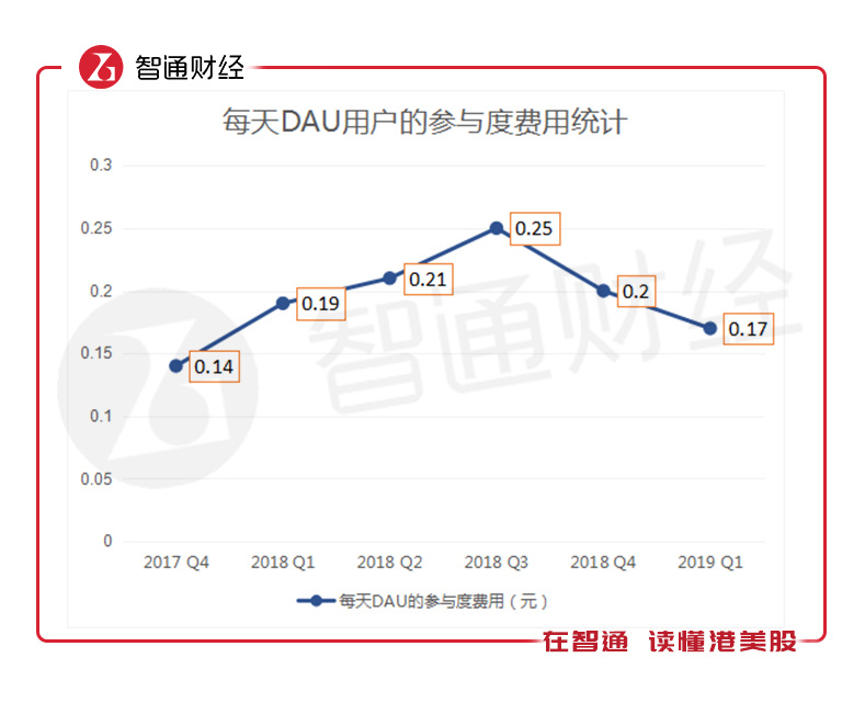 而趣头条也正是这么做的。从2017年第四季度至2018年第三季度,趣头条每天DAU参与度的费用稳步上升,近乎翻倍,而在2018年第四季度时,趣头条开始减少补贴的力度,2019年一季度时,补贴下降至每天0.17元。