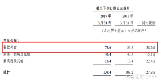 虽然美团从战略上宣称重点打造“吃喝玩乐”的生态圈,但从经营数据来看,美团外卖依然是这家“千亿独角兽”的最大支撑点。数据显示,2019年Q1,美团的餐饮外卖业务交易额达到756亿元(人民币,单位下同),同比增长38.6%。