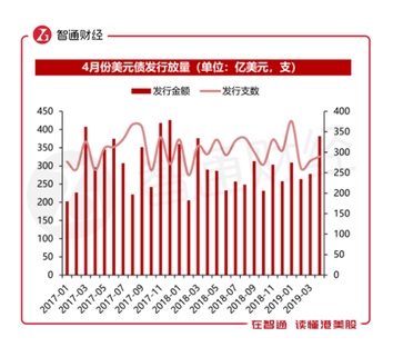 基于此,中资美元债发行于2019年4月份进入加速阶段。当月共发行290只美元债,发行金额为382亿美元,同比上升31.9%,环比上升37.4%;剔除银行发行的债券,中资美元债共发行52只,发行金额219亿美元,同比上升43%,环比上升52.1%。相比1-3月5%的环比增速,4月势头明显不一样。