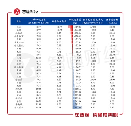 其中一大批房企美元债融资成本在大幅降低。其中以恒大美元债融资改善最为明显,目前加权息票相比2018年回落超过了3个百分点,公司也将融资额由30亿美元大幅增至67亿美元。正荣(06158)、雅居乐以及合景泰富(01813)加权息票也下降超过1个百分点,而正荣、华夏幸福和融创截止5月初的美元债发行额,更是都超过了2018年全年。