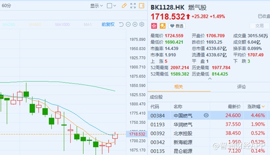 智通财经APP观察到,24日港股收盘,燃气股上涨1.49%,再次站上10日线。个股方面,以中国燃气(00384)为首,单日上涨4.46%,后边有华润燃气(01193)、北京控股(00392)等港股巨头燃气企业纷纷收红。