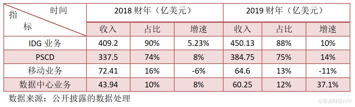 以下为该公司最近两年业务的增长及占比情况(IDG业务包括PSCD和移动业务):