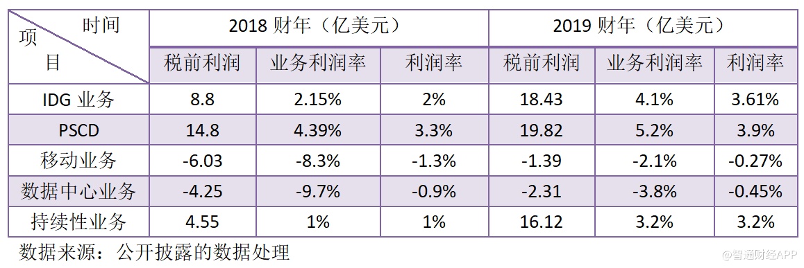 就目前来说,盈利业务仍是PSCD业务,2019财年,该业务税前利润率5.2%,利润率(业务税后利润/总收入)3.9%,同比均有提高,而移动业务和DCG业务亏损幅度同比缩小,使得持续性业务利润率3.2%,同比增加2.2个百分点,盈利状况有较大改善。