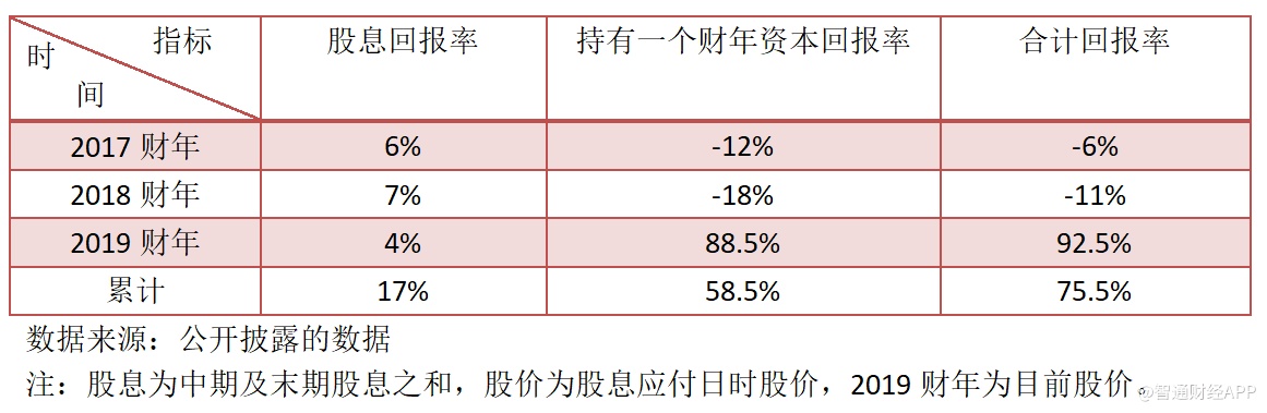 而且,联想派息稳定,往年股息回报率达到4%以上,这个在同行中算较高的,2019财年,该公司股息率4%,而同行中,苹果仅为1%,惠普为3%,戴尔目前是亏损的,近三个财年,该公司实现股息回报率17%。从综合回报率来看(股息率+持有资本证券收益),持有一个财年为期,累计实现投资回报率75.5%。