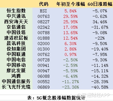 年初至今,恒生指数涨幅为5.83%,在统计的14支5G概念股中,仅有6支跑赢大盘,其中,中兴通讯(00763)以29.59%的涨幅位居第一位。而长飞光纤光缆(06869)的表现则不尽如人意,年初至今跌幅23.36%。