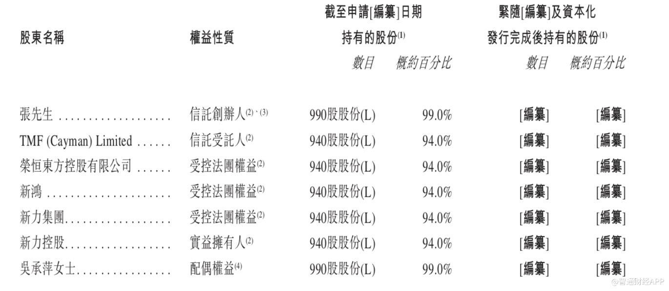 其中,新力控股的全部已发行股本由新力集团全资拥有,二新力集团则有新鸿全资拥有。新鸿由荣恒东方控股有限公司全资拥有,而荣恒东方控股有限公司由家族信托受托人TMF(Cayman)Limited全资拥有,该家族信托为由张先生成立的全权信托,而张先生及张先生的家族成员为受益人。