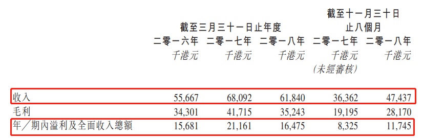 据招股书显示,截至2016年、2017年、2018年3月31日止三个财政年度以及截至2017年及2018年11月30日止的八个月内,万亚企业分別取得收益为5566.7万港元、6809.2万港元、6184万港元、3636.2万及4743.7万港元;期內取得溢利及全面收入总额约为1568.1万港元、2116.1万港元、1647.5万港元、832.5万及1174.5万港元。