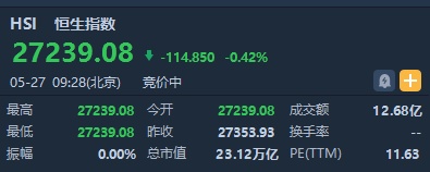 智通财经APP获悉,恒生指数开盘跌0.42%,报27239.08点。国企指数跌0.53%,报10390.28点。红筹指数跌0.23%,报4263.09点。大市盘前成交12.68亿港元。