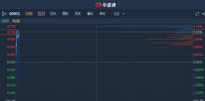 智通财经APP获悉,中芯国际(00981)上周五(5月24日)晚间公告称,主动申请于美国纽交所退市,截至9时35分,涨3.33%,报价8.7港元,成交额5706万。