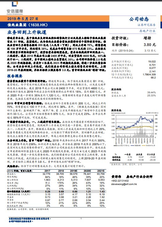 智通财经APP获悉,5月27日,安信国际发布研报指出,佳兆业集团(01638)业务回归到上升轨道,因应公司新增土储及销售交付的情况,上调2019-2020年盈利预测,并把目标价上调至港币3.8元,重申对佳兆业的“增持”评级。