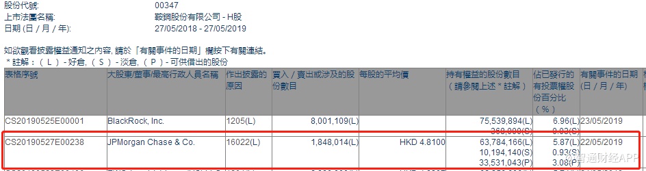 智通财经APP获悉,根据联交所资料显示,摩根大通于5月22日减持鞍钢股份(00347)184.8万股,每股作价4.81港元,总值约888.89万港元,最新持股数目约6378万股,最新持股比例为5.87%。