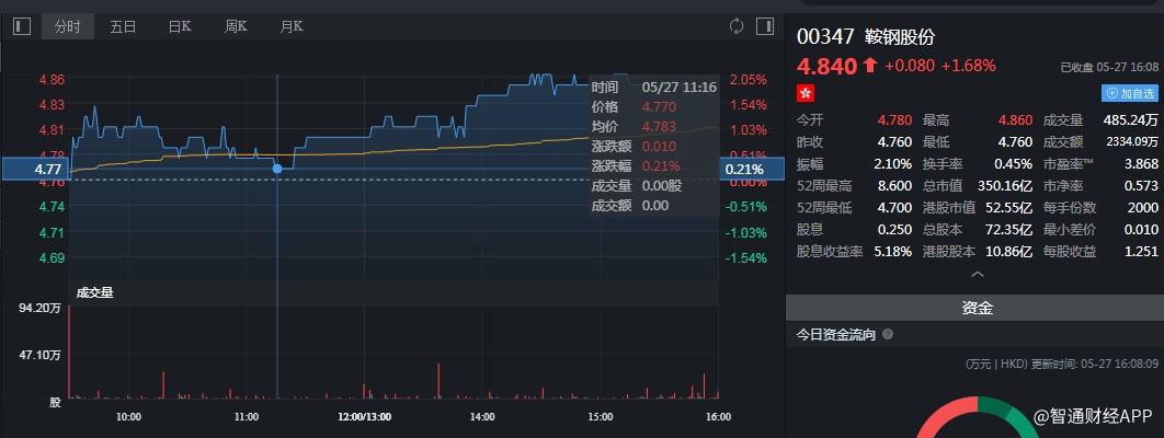 截至今日收盘,鞍钢股份(00347)涨1.68%,报4.84港元。
