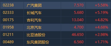 智通财经APP获悉,汽车板块早盘集体反弹,截至发稿,长城汽车(02333)、广汽集团(02238)涨超5%,北京汽车(01958)、吉利汽车(00175)涨超4%。