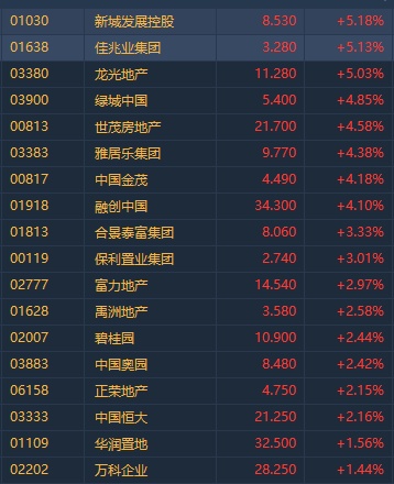 智通财经APP获悉,内房股今日回暖,临近午间收盘涨幅扩大,截至发稿,新城发展控股(01030)、佳兆业(01638)、龙光地产(03380)涨超5%,绿城中国(03900)、中国金茂(00817)、融创中国(01918)涨超4%。