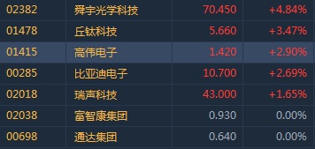 智通财经APP获悉,手机产业链全线反弹,舜宇光学(02382)领涨板块。截至13时37分,舜宇光学涨4.84%,报价70.45港元,丘钛科技(01478)涨3.47%,高伟电子(01415)涨2.9%,比亚迪电子(00285)涨2.69%,瑞声科技(02018)涨1.65%。