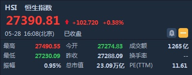 智通财经APP获悉,恒指早盘低开0.05%,报27274点。截至收盘,恒生指数涨102.72点或0.38%,报27390.81点,全日成交额达1265.8亿。国企指数涨0.13%,报10416.55点,红筹指数涨0.32%,报4281.46点。