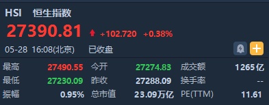 截至收盘,恒生指数涨102.72点或0.38%,报27390.81点,全日成交额达1265.8亿。国企指数涨0.13%,报10416.5点,红筹指数涨0.32%,报4281.46点。