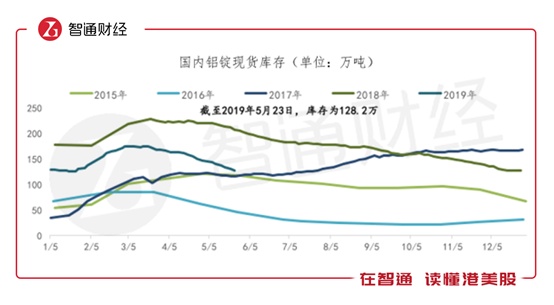 成本提升对电解铝形成较强的价格支撑,而且电解铝也迎来了旺季去库存期,行业盈利得以改善。智通财经APP了解到,铝价现货期货价格都在不断上行,与此同时行业于4月下游需求的逐步复苏,库存去化正不断加速,截止5月23日库存仅为128.2万吨,基本低于2018年全年的库存位。