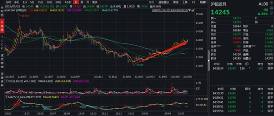 铝价受此消息刺激大幅上行,27日沪铝1907合约涨幅为0.92%,收盘报14310元/吨。行业龙头中国铝业的股价,也自5月27日开始底部回升,28日开盘后快速拉涨,盘中涨幅一度超过了5%,最终收涨至2.93%。