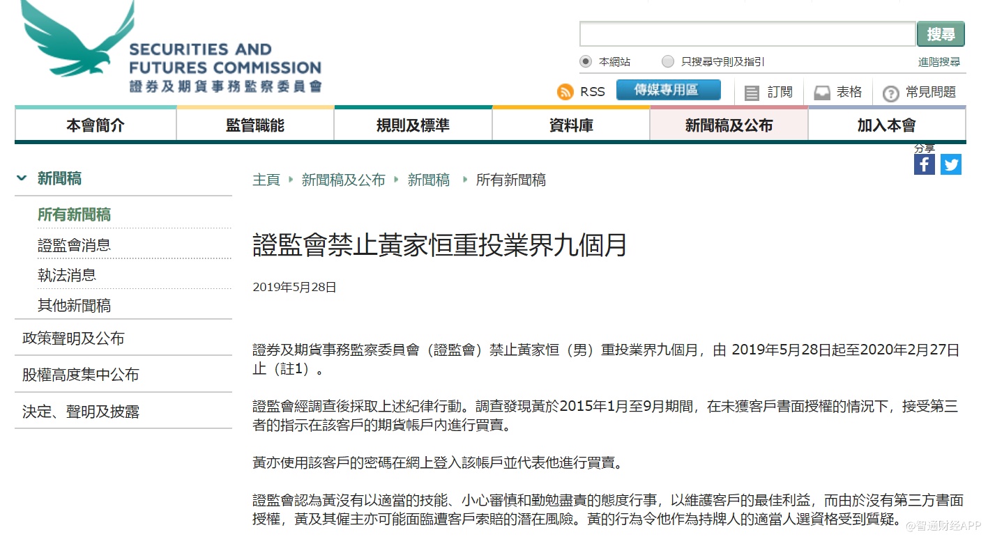 智通财经APP获悉,证监会官网今日公布,禁止黄家恒重投业界九个月,由2019年5月28日起至2020年2月27日止。