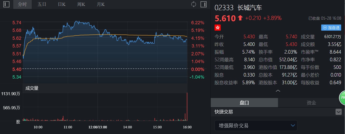 截至今日收盘,长城汽车(02333)涨3.89%,报5.61港元。