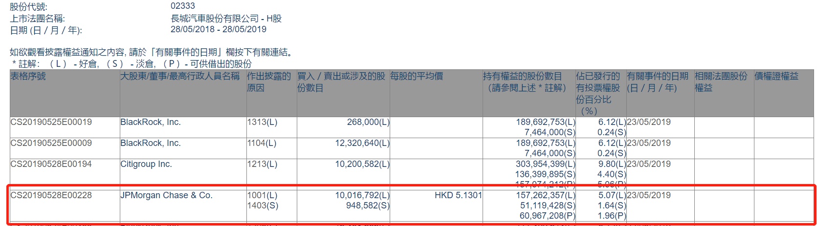智通财经APP获悉,根据联交所资料显示,摩根大通于5月23日增持长城汽车(02333)1001万股,每股作价5.13港元,总值约5135.13万港元,最新持股数目约1.57亿股,最新持股比例为5.07%。