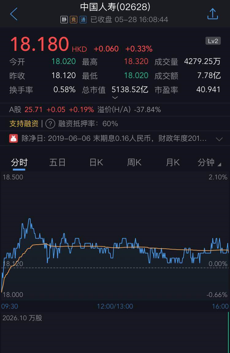 截至今日收盘,中国人寿(02628)涨0.33%,报18.18港元。