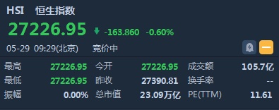 智通财经APP获悉,恒生指数开盘跌163.86点或0.6%,报27226.95点。国企指数跌0.65%,报10348.58点。红筹指数跌0.35%,报4266.54点。大市盘前成交105.68亿港元。隔夜美股高开低走,三大股指全线收跌。