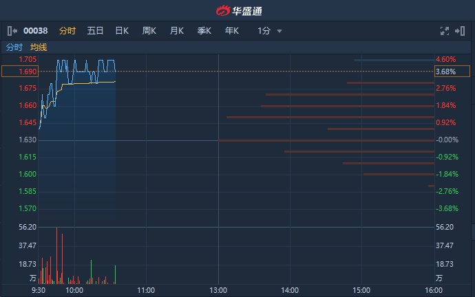 智通财经APP获悉,第一拖拉机股份(00038)A股早盘直线封板,封单达9.5万手,H股亦跟随上涨,截至发稿,涨3.68%,报1.69港元,成交额达752.7万港元。