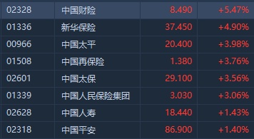 智通财经APP获悉,內险股早盘小幅反弹,午后集体拉升,表现强势,截至发稿,中国财险(02328)涨5.47%,新华保险(01336)涨4.9%,中国太平(00966)、中国再保险(01508)、中国太保(02601)、中国人保(01339)涨超3%。