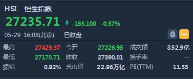 智通财经APP获悉,恒指早盘低开163.86点或0.6%,报27226.95点。午后内险股随A股上涨,带动恒指一度反涨。截至收盘,恒生指数跌155.1点或0.57%,报27235.71点,全日成交额达832.97亿。国企指数跌0.25%,报10390.45点,红筹指数跌0.07%,报4278.35点。