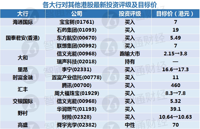 二、各大行对其他港股最新投资评级及目标价: