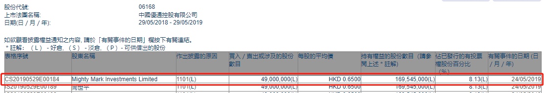 智通财经APP获悉,根据联交所资料显示,Mighty Mark Investments Ltd于5月24日增持中国优通(06168)4900万股,每股作价0.65港元,总值约3185万港元,最新持股数目约1.70亿股,最新持股比例为8.13%。