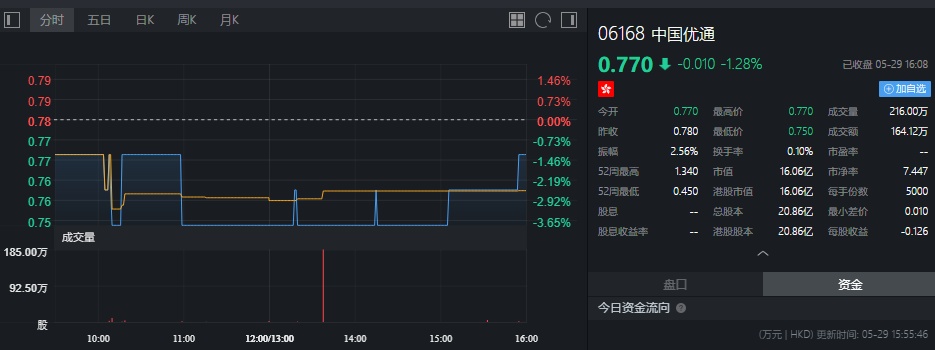 截至今日收盘,中国优通(06168)跌1.28%,报0.77港元。