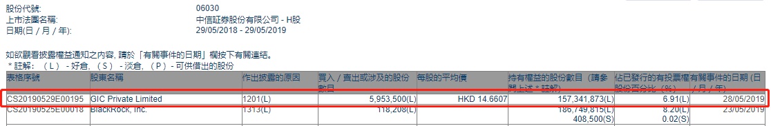 智通财经APP获悉,根据联交所资料显示,GIC Private Ltd于5月28日减持中信证券(06030)595万股,每股作价14.7港元,总值约8747万港元,最新持股数目约1.57亿股,最新持股比例为6.91%。