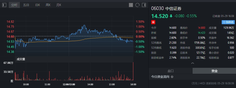 截至今日收盘,中信证券(06030)跌0.55%,报14.52港元。
