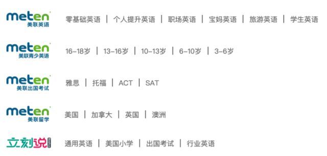 美联教育在创业之初主要做线下英语培训,随后扩展到留学领域,最后扩展到在线教育领域。旗下品牌包括美联英语、美联出国考试、美联留学、立刻说(在线英语)、ABC外语。