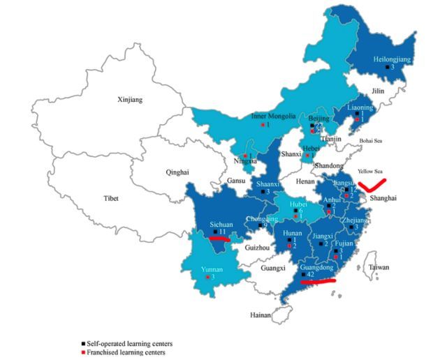 截至2019年第一季度,美联共有120个自营学习中心、16个加盟特许中心。广东、江苏、四川最多,分别有42个、12个、11个。值得一提的是,美联在2018年4月收购了ABC外语,贡献21个自营中心和16个加盟特许中心。也就是说,美联之前只有99个自营中心。