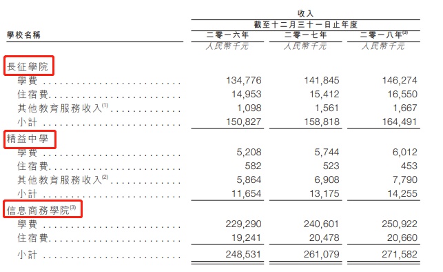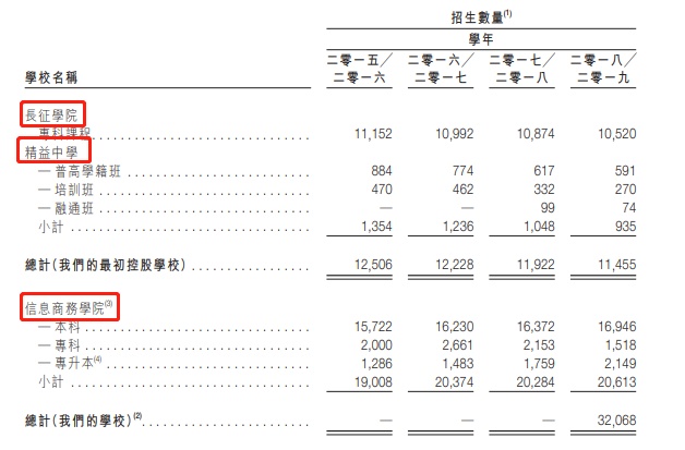 据招股书显示,嘉宏教育旗下共有三所学校,其透过结构性合约控制并经营两所学校,即长征学院和精益中学,以及一所合营学校,即信息商务学院,该校由嘉宏控股集团持有其65%出资人权益。其中,长征学院是一家职业教育机构,提供正规的大专教育,而精益中学的招生对象主要是高中生。