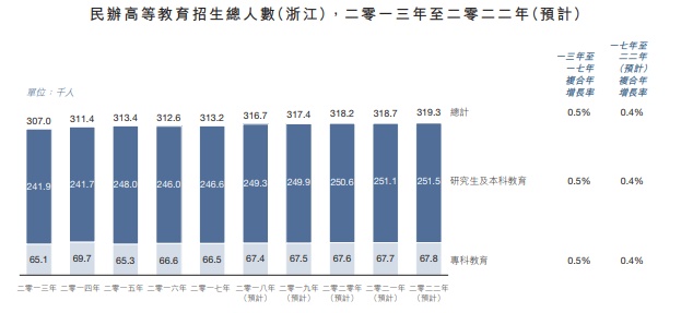 据招股书,民办高等教育行业总收入2017年至2022年预计将由人民币1151亿元增至人民币1812亿元,复合年增长率为9.5%,相比之前几年增速有所下滑,招生总人数平缓增长(复合年增长率1.4%)的情况下,收入增长主要来自包括学费、杂费及其他收入的涨价及提升,另一方面来自对民办高等教育支持的拨款收入的快速增长。