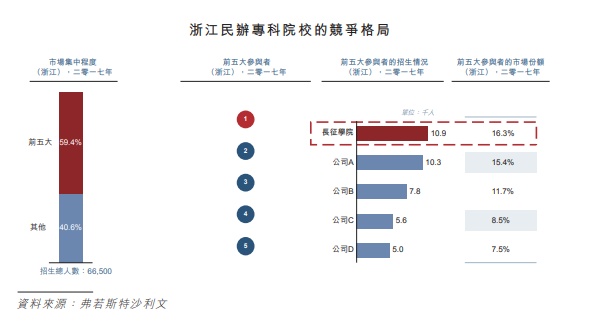 据弗若斯特沙利文的报告,嘉宏教育在浙江省的市场占有率较大,在招生方面,长征学院于2017年排名市场第四,占该市场份额的3.5%;在民办专科学院市场上,长征学院则排名第一,占民办专科院校市场的16.3%;精益中学在浙江民办高中教育市场的份额稍低,为0.5%。